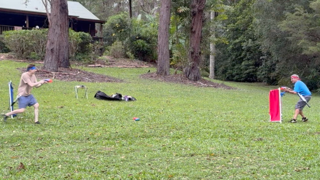 Flint, the creator of Backyard Blasters, believes the game most people play when having a Nerf War/Dart Gun Battle at home or in the backyard, (or both) is “lets just shoot at each other until we get bored”.